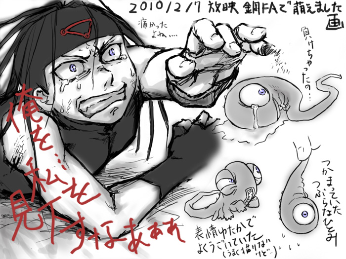 なんとも切な萌える回でした。痛がり悶絶するエンビ、飛び跳ねる百面相のクリオネ、もうどうしようかと思いました。原作者様、アニメ製作者者の皆様、しがないヲタにめくるめくエクスタシーをありがとう。 動物と人間を掛け合わせたキメラ達に見くだされてギーギー怒る エンビたんは人間の魂がずっしりつまったいわば人間のキメラ(注)。その本当の姿に戻ると、身体からは手や足にくわえて色々な物が一杯はえています。例えいいヤツだったとしても生きていける場所はだいぶ限られているでしょう。弱くても愚かでも人間はたくさんいるし、やはりたくさんいる生き物はお互いに助け合ったり支え合ったりするので、少数派は圧倒的に不利なのです。 えげつないし同族でもないので実際にいたらとても友達にはなれないと思いますが、世界にたった数人しか仲間がいないという超絶少数派の立場から、焼かれても剥かれても身体を張って世界征服しようとするエンビたんとその仲間達の姿に熱い感動を覚えるのを止めることは出来ません。例えどんなに人生が長いとしても数十億vsヒトケタで戦いを挑む無謀さはなかなか持てないものです。そして何かの本が言っていたとおり、世界を支配するのは実は面倒くさくてあまり楽ではない仕事なのです。こんなドラマ、リアルではなかなか見られるものではありません。 何だかよく分からない話になってきましたが、とにかく今日のエンビたんは最高でした。(2010/2/7) +追記 とは書いてみたものの、そういえば最終目標が世界征服なのかはよくわからないのでした。例えばエヴァ式に「みんなひとつの生命体になろう!」とかだった場合それは世界征服といえるのだろうか… (注)異種族を掛け合わせて出来た個体にくわえて、受精卵の段階で二つ以上の同種族個体の細胞を融合させてできた胚およびそこから発生する個体も確かキメラというはずなので。 back |