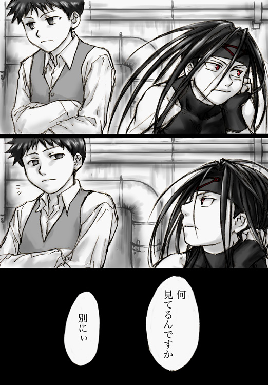 同じだけど 違っていた 違ってたけど どこか同じだった 二人 三人……七人 たくさんいたことの意味は 何 もう永久に わからない 【あとがき】 原作の方でウロボ兄弟が減っていくのでつい…(´;ω;`) 鬱ネタすいませんorz シチュとしてはラストのいなくなった後かまたは、更にもっと後、23巻以降のエンビが回想していると解釈していただいても…(← プライド兄ちゃんとエンビは原作ではあまり接点がないですが、個人的には(ショタなので)この組み合わせ好きです。 ちなみに上の問いに対する答え、兄ちゃん的には「どのみち、もともとは同じものですからたくさんいてもいなくても同じことです。あなたも、いつでも私の一部にしてあげますよ(にっこり)。」とかなっちゃうのだろうか…。 そもそもエンビには自己の存在への疑問を持つような自我の目覚めがあったのだろうか…。考え始めると思考の迷宮にはまります。いやまあどうでもいいんですが。 (2010/1/24) |